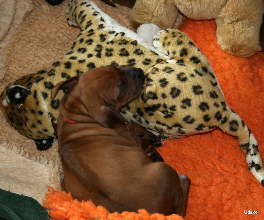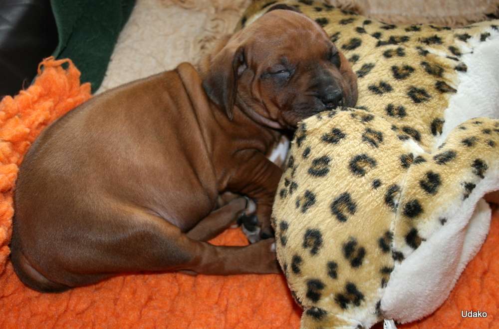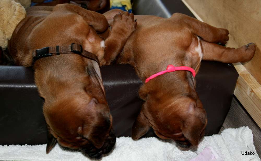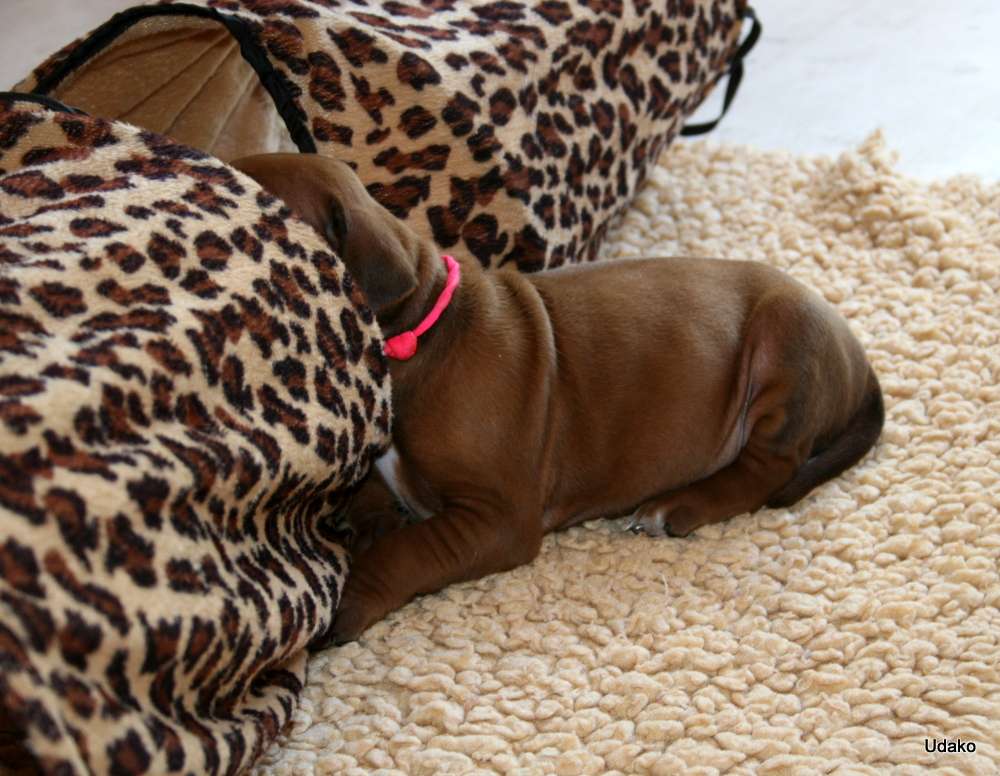 Heute sind unsere Puppies 4 Wochen alt und wir haben unseren Rhythmus gefunden….. es wird natürlich immer noch sehr viel geschlafen und bei Mutti Grace getrunken, aber auch festere Nahrung wird schon aufgenommen. Wir befinden uns hier mittlerweile im 5 Stunden Takt und auch nachts hat Grace wie alle guten Hundemütter ihre innere Uhr. Auch Grace schläft viel, es ist ja auch kein Wunder bei den Strapazen der letzten vier Wochen und natürlich auch, weil sie ebenfalls viel fressen muss oder besser gesagt darf. Es ist schon eine Menge, was eine Hundemutter da zu sich nimmt…..