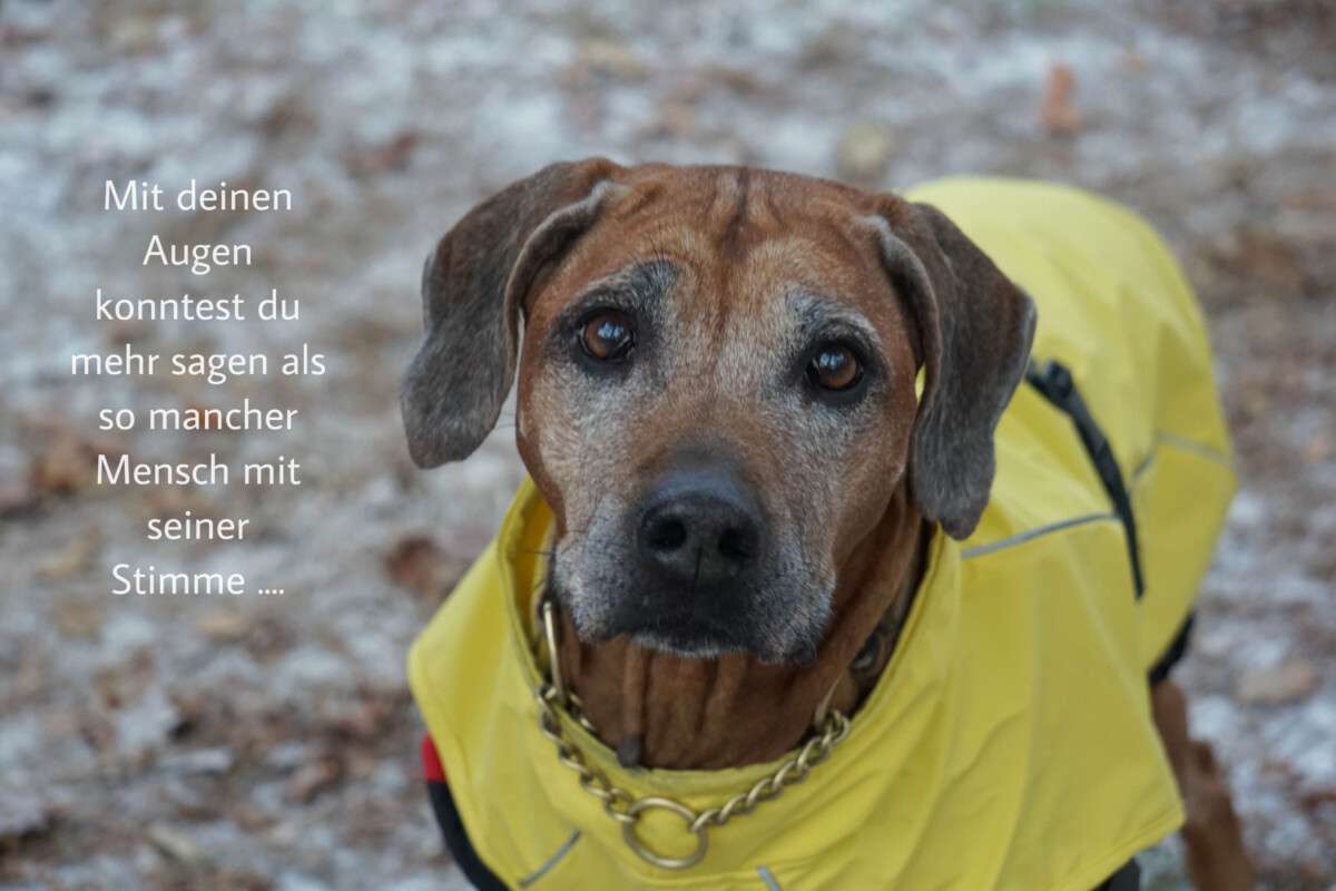 Dein Wesen war fröhlich aber auch sehr eigensinnig, sportlich und zuhause herrlich faul, du hast Wärme geliebt und dein Schlecht-Wetter-Regen-Gesicht hat immer Bände gesprochen. Überhaupt haben deine Augen immer mit mir gesprochen und deine Mimik war sensationell, ich konnte immer sehen, wie es dir ging.
