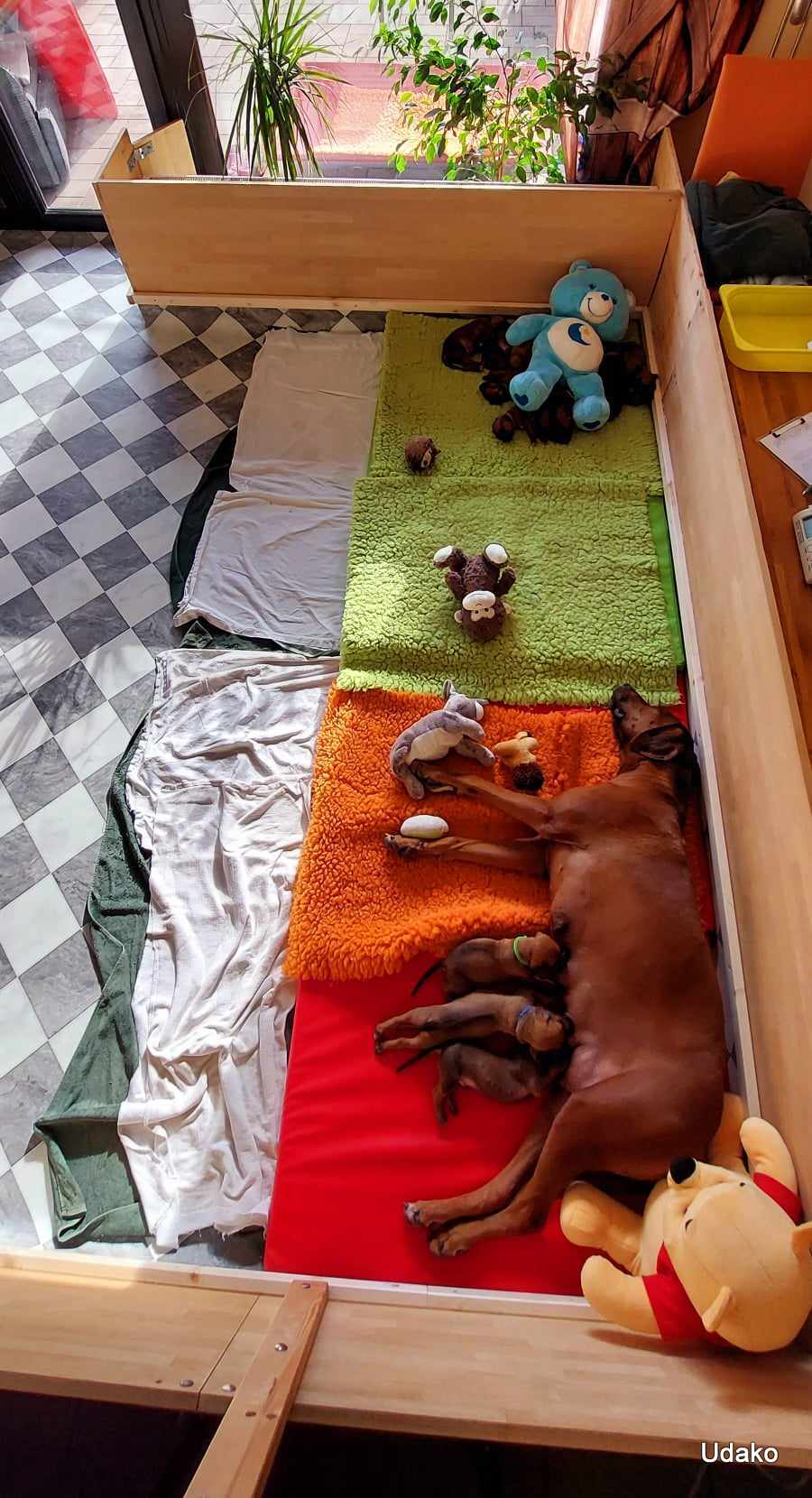 Hier mal eines von heute morgen und man merkt Grace an, dass sie happy ist. Sie kann selber entscheiden, ob sie bei ihren Welpen liegen möchte, was sie derzeit vorzieht, oder ob sie auch mal draußen liegen möchte.