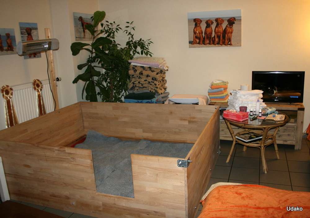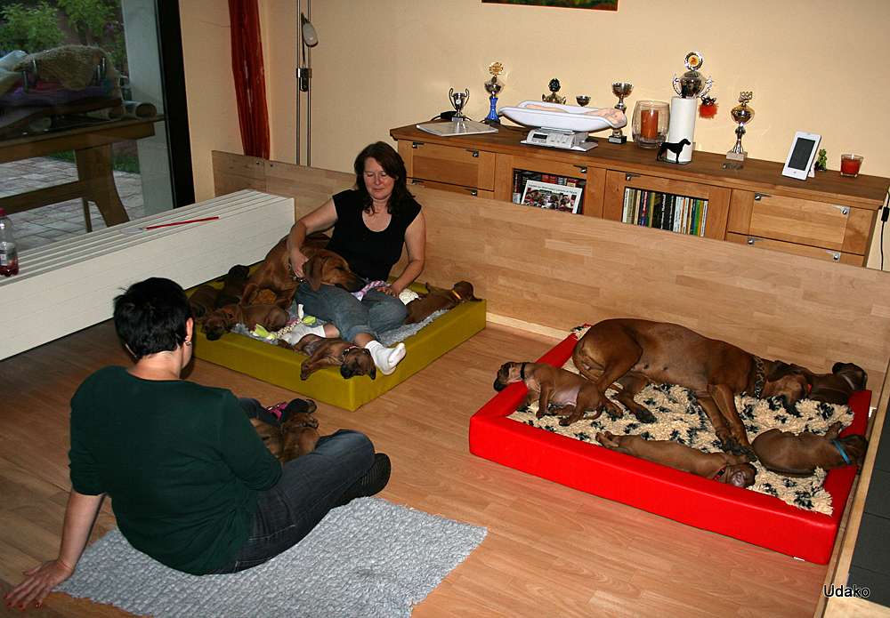 Die Wurfkiste, in der die Welpen geboren werden, wird inmitten des Wohnzimmers errichtet. Dort verbringen die Welpen die ersten beiden Lebenswochen mit ständiger Fürsorge durch mich und die Mutterhündin. Danach ziehen sie in ein extra hergerichtetes Welpenzimmer, welches ebenfalls in mein Wohnzimmer integriert ist. Dort werden sie mit sämtlichen Geräuschen eines Haushalts konfrontiert. Vom Welpenzimmer aus haben sie jederzeit freien Zugang in den Garten, der dann zum „Welpen-Spiele-Paradies“ wird und in dem sich auch meine anderen Rudelmitglieder frei bewegen dürfen.